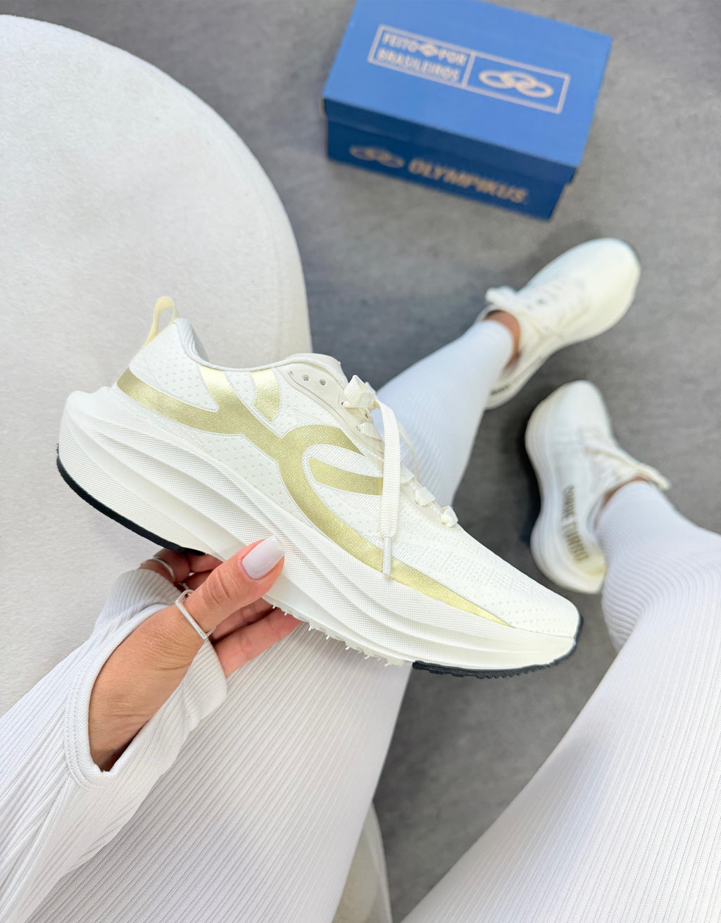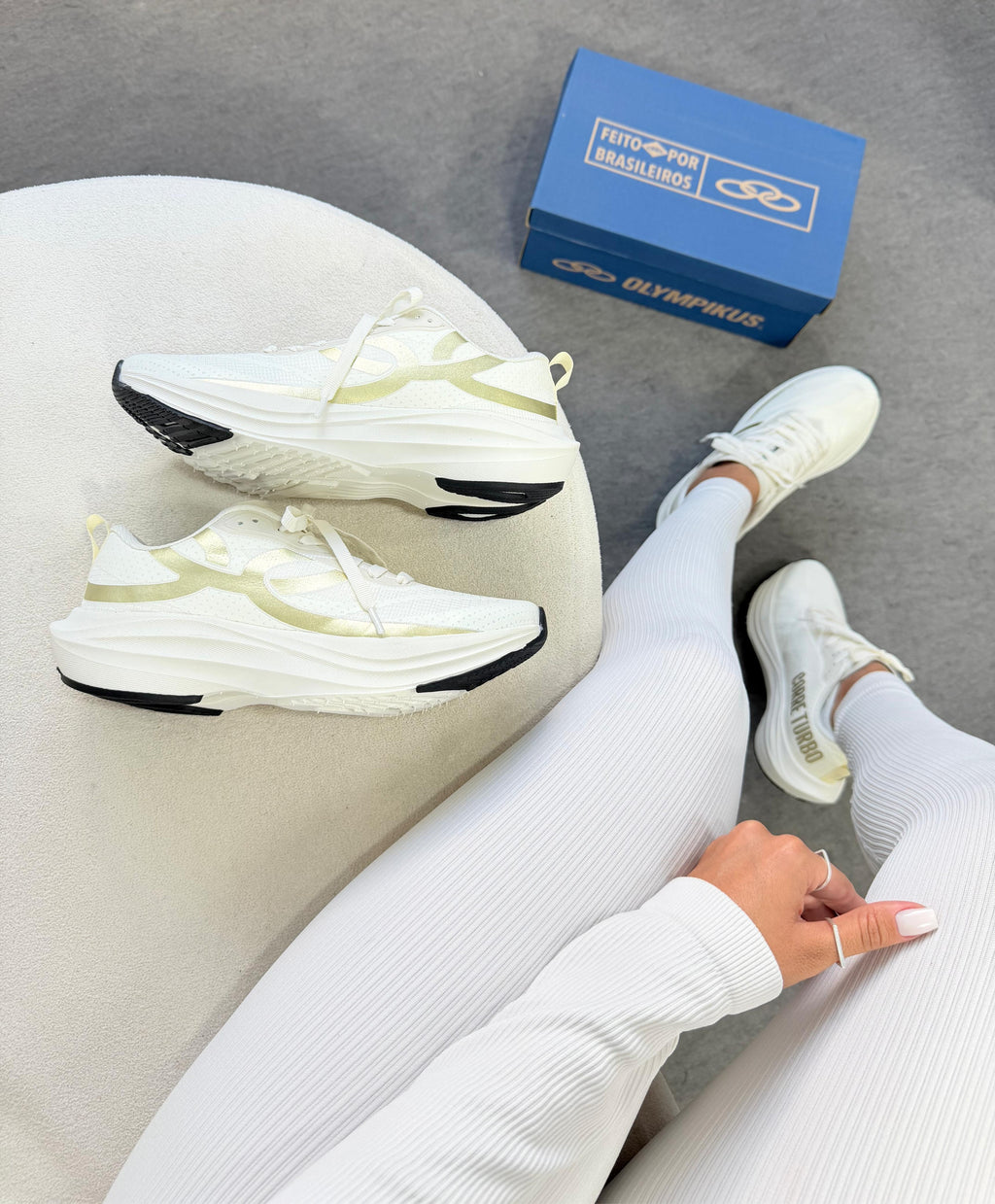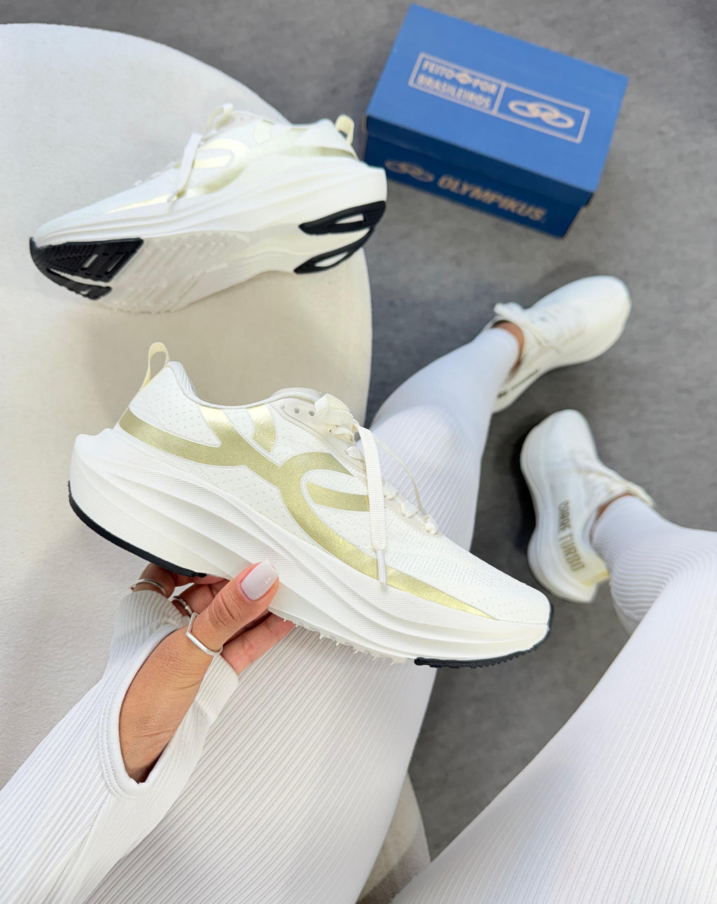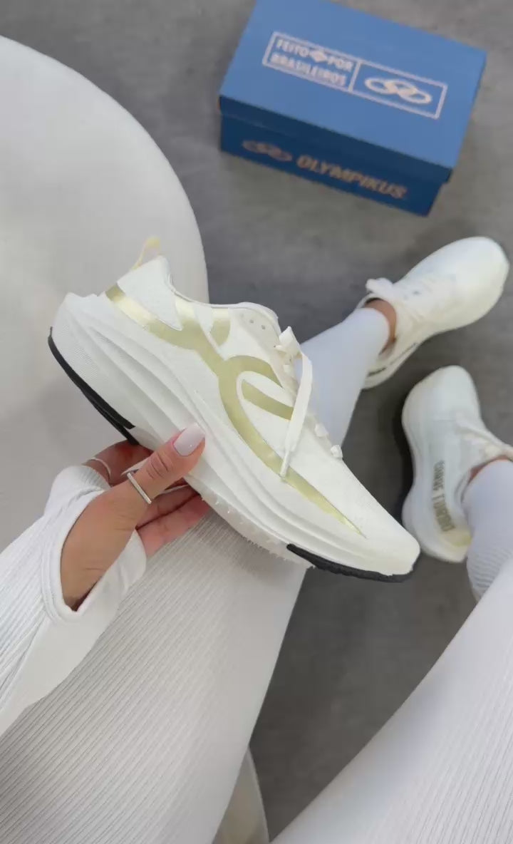O off white com detalhes dourados entrega um visual sofisticado e moderno â enquanto a tecnologia interna garante leveza, velocidade e resposta em cada passada.