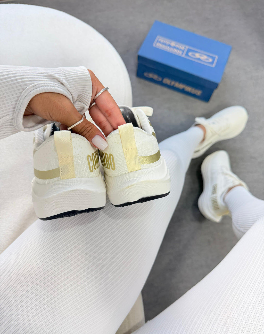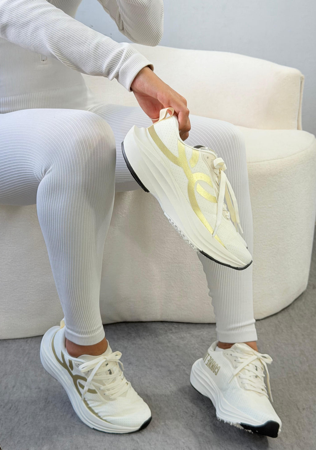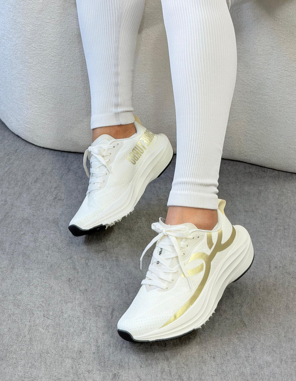 O off white com detalhes dourados entrega um visual sofisticado e moderno â enquanto a tecnologia interna garante leveza, velocidade e resposta em cada passada.