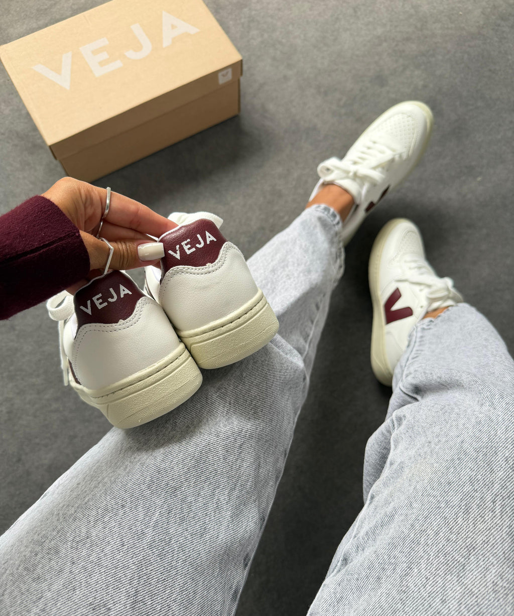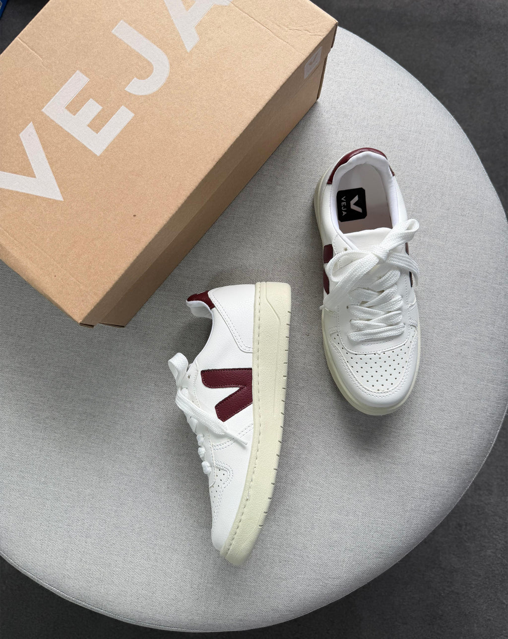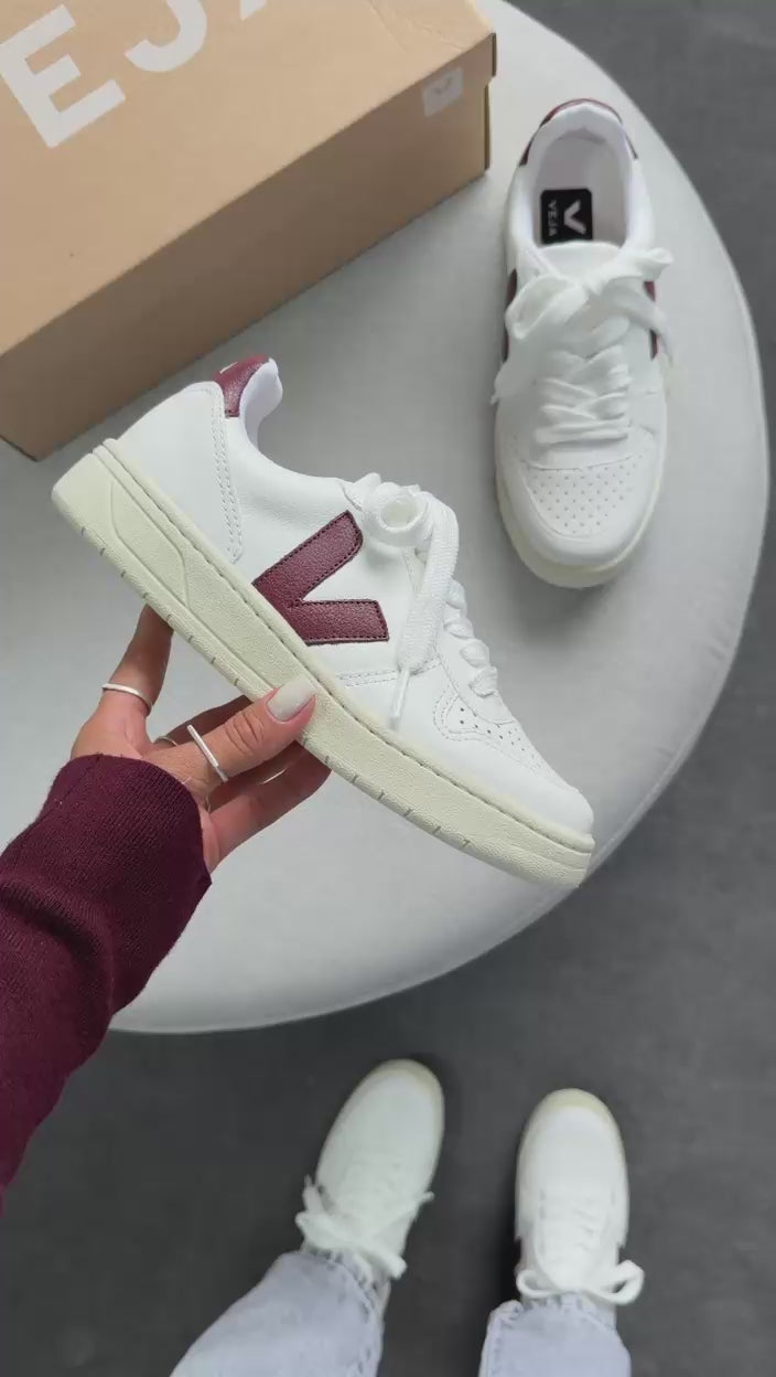 O Veja V-10 â Branco/Marsala combina a estĂ©tica clean do branco com detalhes em marsala sofisticados, entregando um visual equilibrado, moderno e cheio de personalidade.