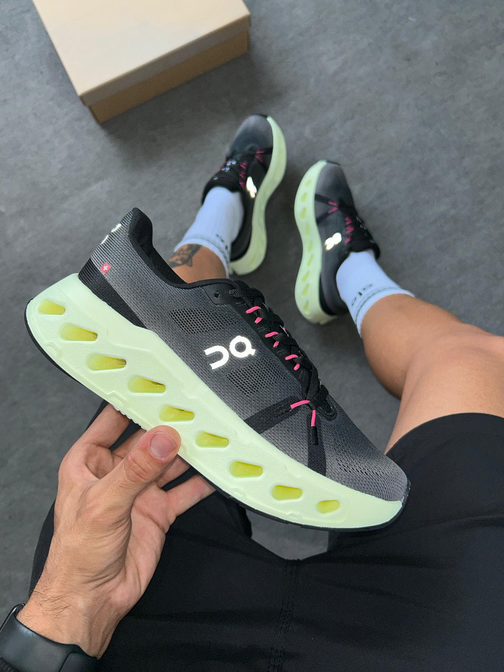 O On Cloudtilt Premium – Grafite/Verde foi feito para quem passa o dia em movimento e exige conforto máximo sem abrir mão de personalidade.