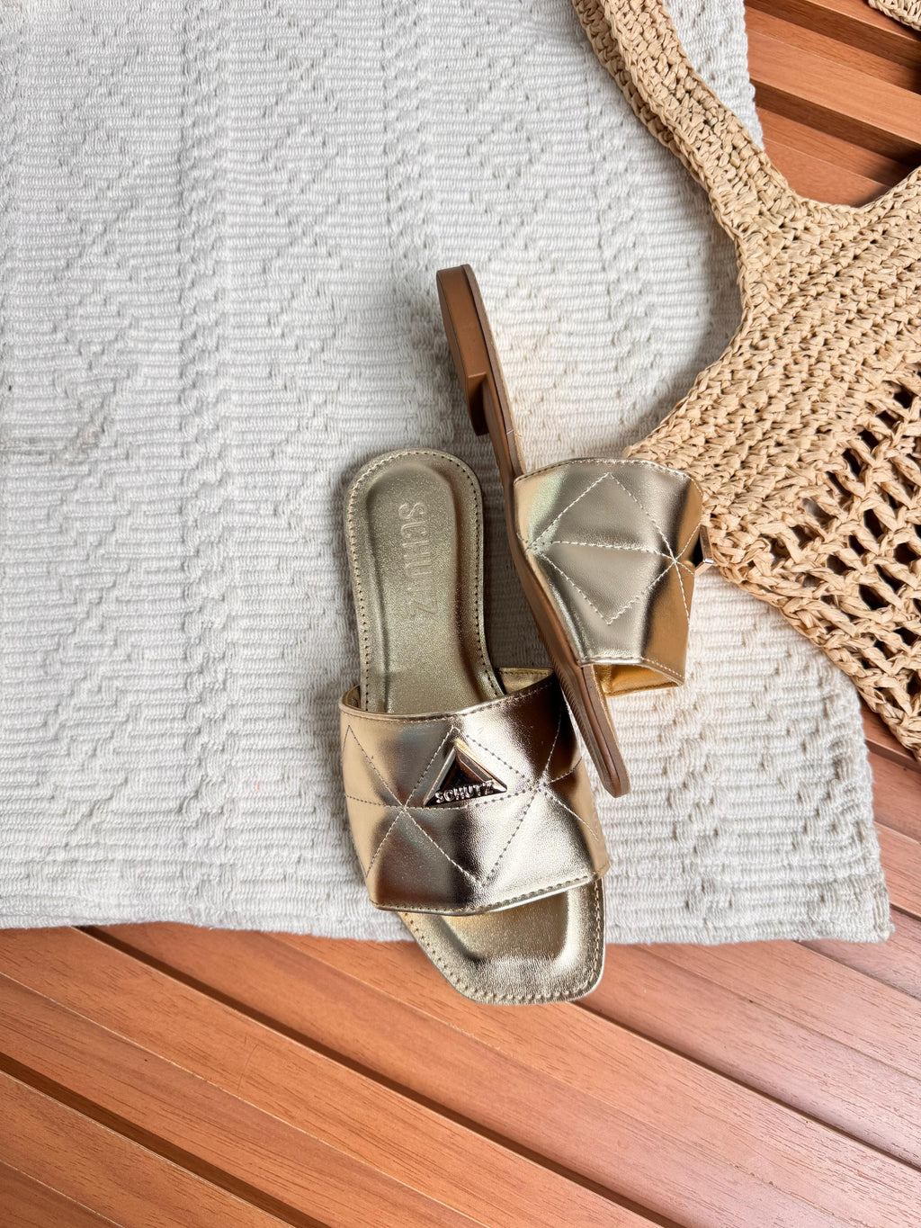 ⚡ Rasteira Schütz Basic Dourada – simplicidade elegante, brilho e presença em cada passo!
